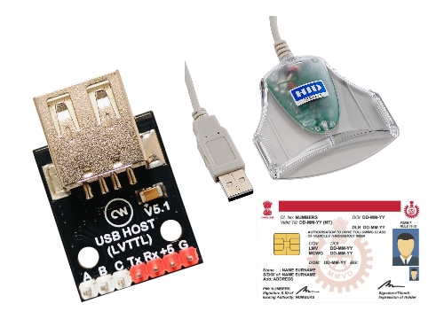 This USB Host Module works with a USB CCID reader to read the name & other details of a driving license and RC book of a vehicle.